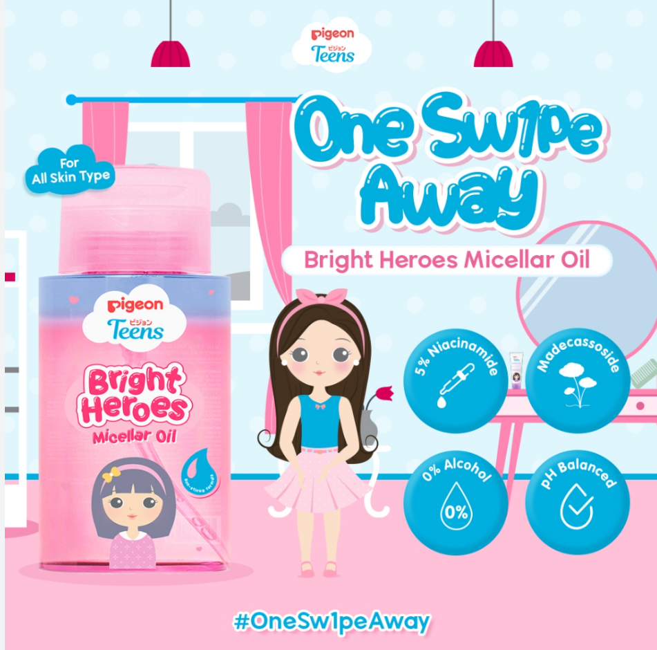 PIGEON TEENS BRIGHT HEROES MICELLAR OIL 100 ML| Micellar Oil Pembersih Wajah Double Cleansing| Skincare & Oil Infused|Make Up Remover| Semua Jenis Kulit| Niacinamide 5% Pigeon Teens Bright Heroes Micellar Oil dengan 2 in 1 formula,